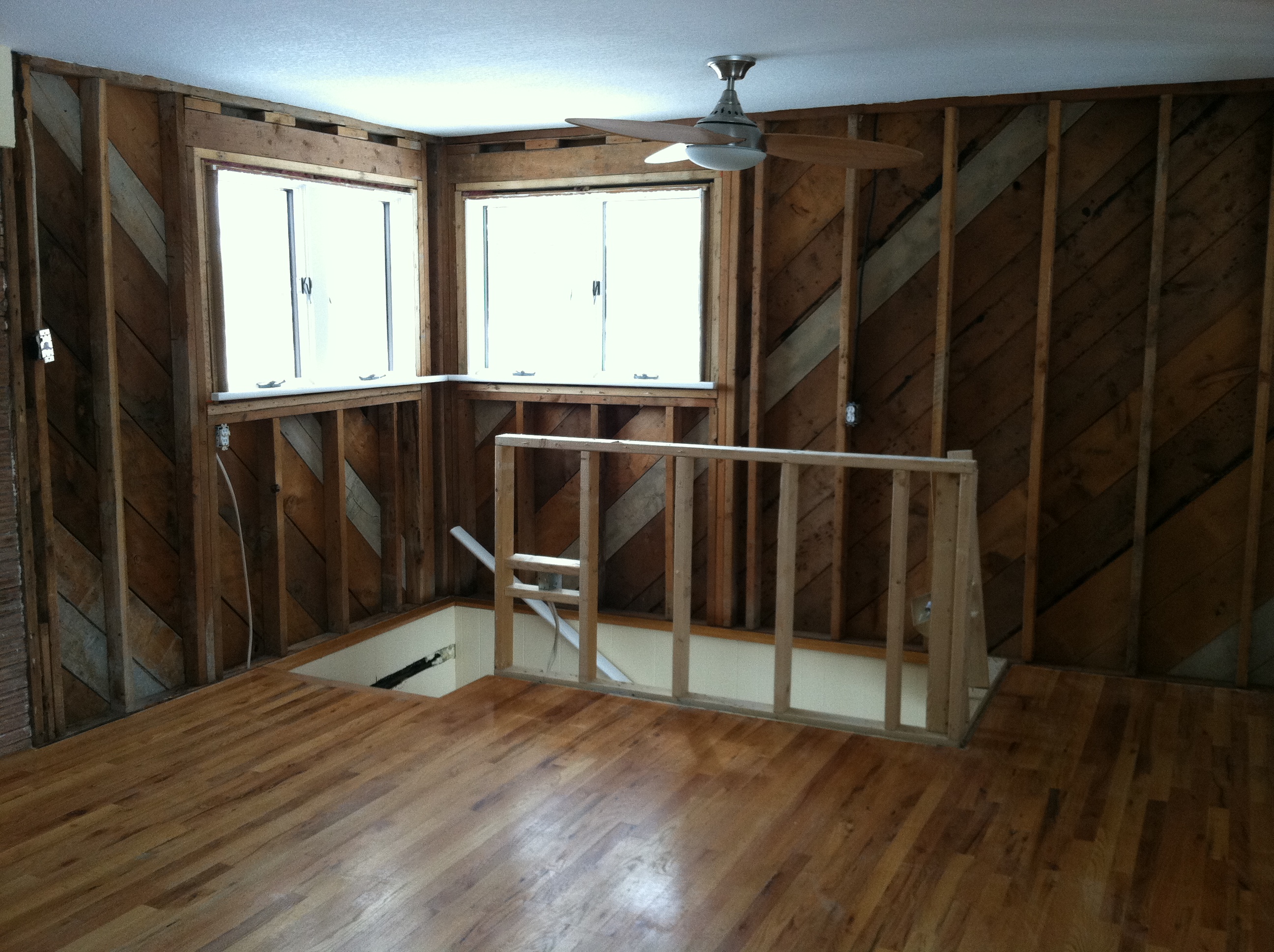 I am starting to feel a bit like were in the money pit. We knew we’d find surprises that needed fixing or repair, but some of what we found when we pulled off the drywall was downright scary. For example, the front entry and guest bathroom were built over what used to be a deck. Literally they built right on the deck and just closed things in to look like it was properly framed, supported, insulated and finished space. No wonder that area was always so cold ;).