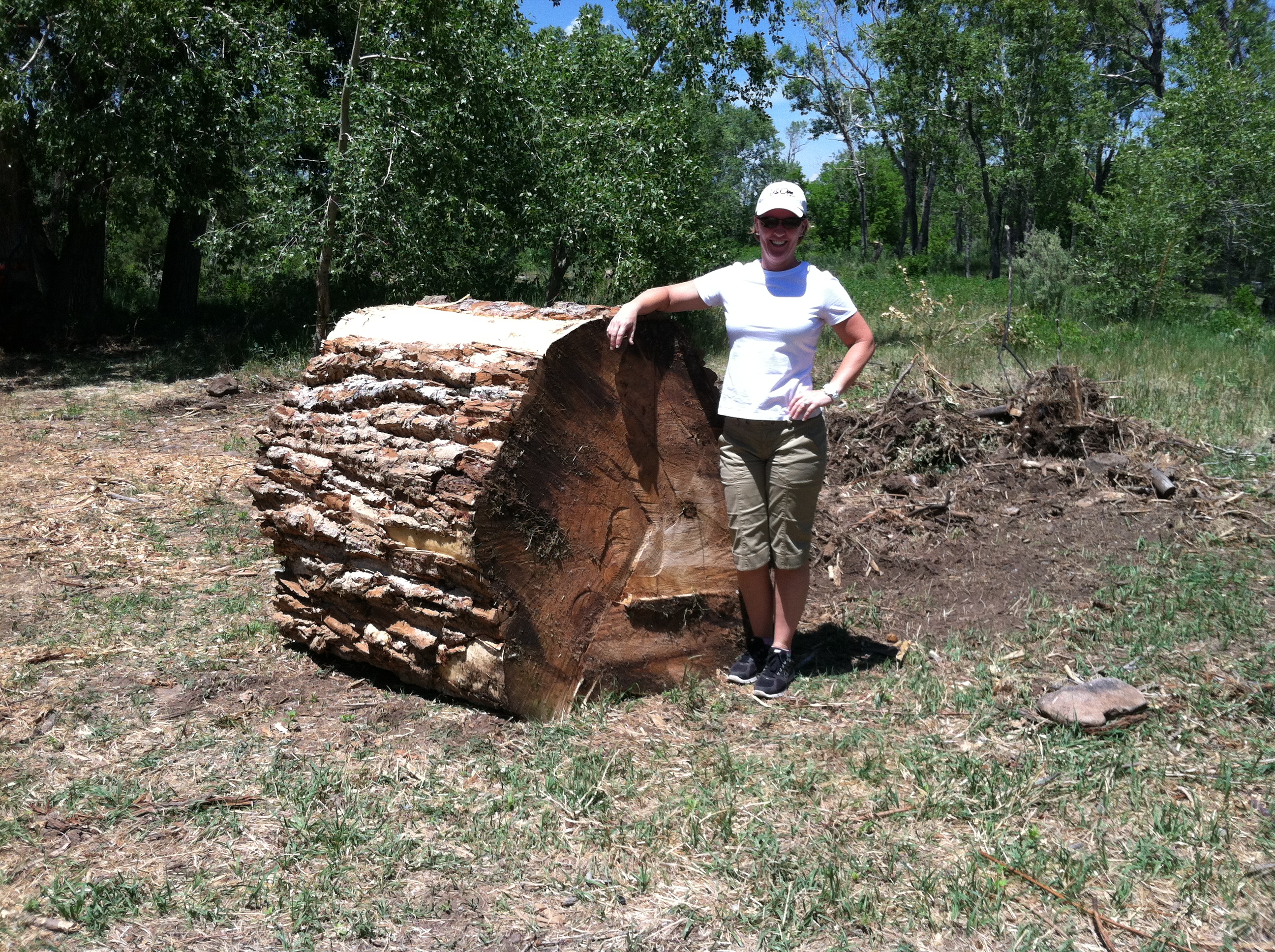 There was one tree in particular that worried us. Sadly, a very old Cottonwood had not only grown over the house, but was laying on the roof and had rubbed off the shingles. Maybe it would crash in a wind storm and make our decisions on scraping v. remodeling easy? Maybe it would kill us in our sleep? 😦 We made the decision to have it removed. It was cut in chunks and removed by crane over the top of the house. Yikes! We mulched a pile as big as our garage and spent our summer spreading that cottonwood mulch over our paths and landscape.